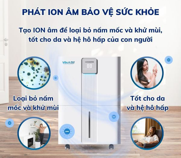 - Lọc không khí Ion Âm/Plasma: Không chỉ hút ẩm, máy còn kết hợp công nghệ Ion giúp khử mùi, diệt khuẩn và nấm mốc trong không khí, bảo vệ sức khỏe đường hô hấp.